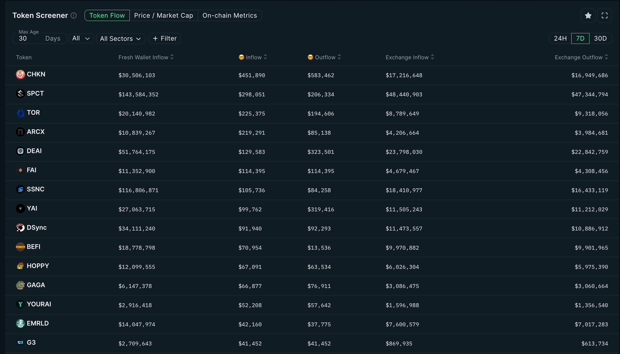 AIDOGE provides a high-level overview of key onchain metrics for all tokens on Ethereum, enabling you to quickly identify tokens that have attracted the interest of Smart Money traders. It features metrics such as token flows to exchanges and wallets, the number of Smart Money holders, and transaction counts—all in a single view. You can filter tokens by the number of days since launch, select the sectors they belong to, and set limits on specific data points within each tab to further hone in on tokens that you care about.
