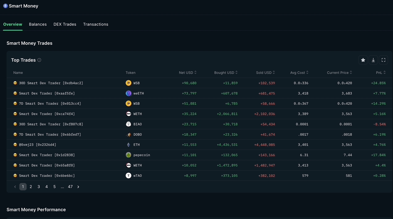 Who’s Buying/Selling: This provides a clear indication of the current sentiment towards a token. If the price is declining but you notice multiple large purchases and Smart Money is buying the dip, it could signal a good buying opportunity, and vice versa.